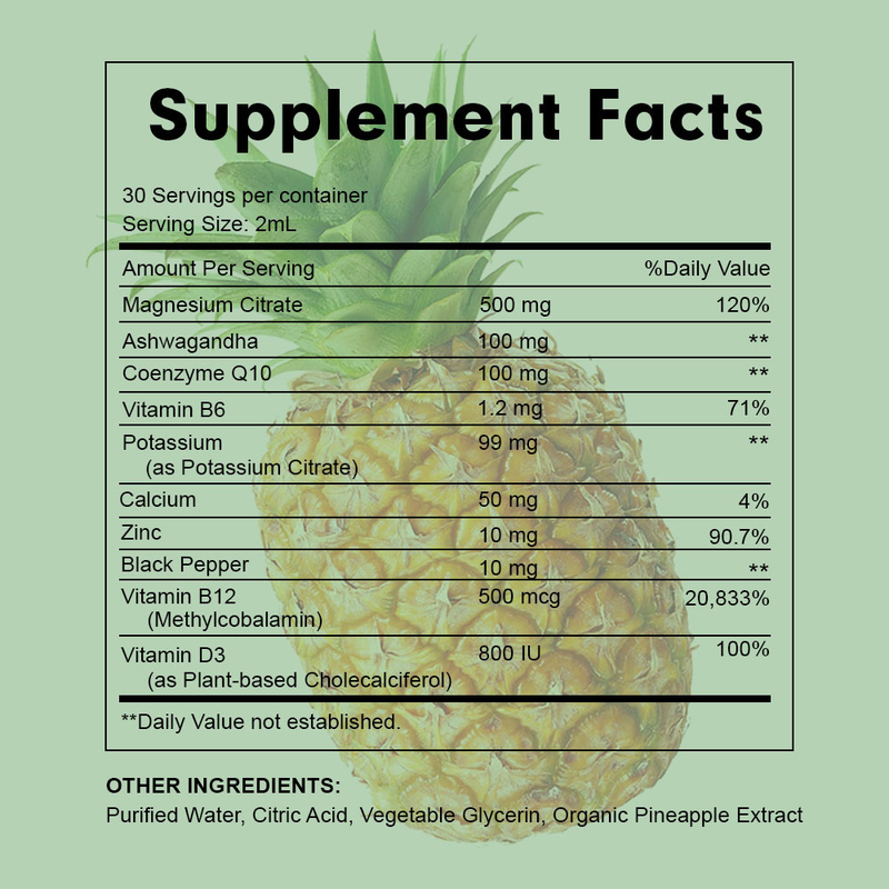 Citrato di magnesio, ashwagandha, coenzima Q10, vitamina B6, potassio, calcio, zinco, pepe nero, vitamina B12, vitamina D3